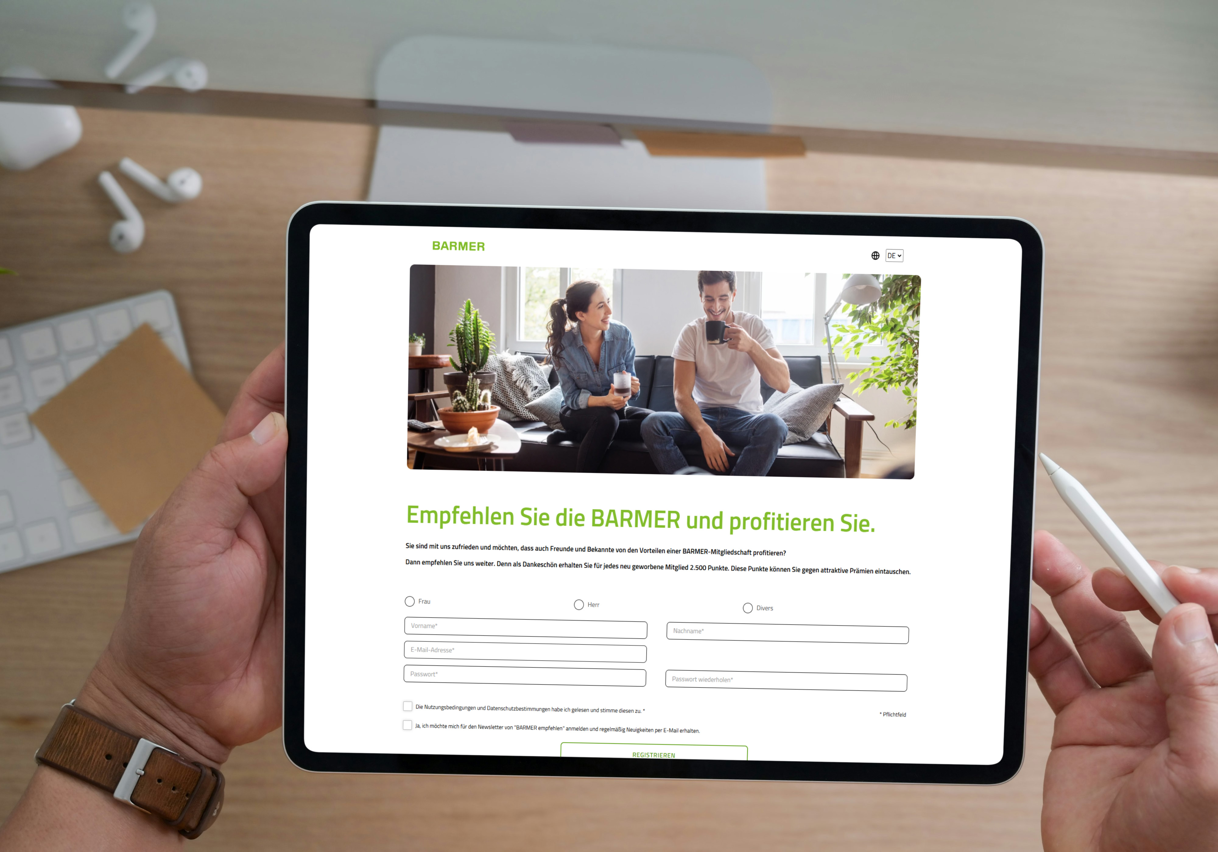Für die BARMER Krankenversicherung ist die Weiterempfehlung ein zentraler Vertriebsweg. Die bisherigen Lösungen waren jedoch unzureichend: Die Belohnungen beschränkten sich auf Barprämien und einige wenige Gutscheine, während die Empfehlungs-Webseite wenig flexibel war und nicht vollständig der Corporate Identity (CI) der BARMER entsprach. Darüber hinaus fehlten Transparenz und Kontrolle über die Daten, und die Performance des alten Systems ließ zu wünschen übrig. Unsere Aufgabe bestand daher darin, ein maßgeschneidertes, modernes Kunden-werben-Kunden-Programm (KWK) zu entwickeln und erfolgreich zu implementieren.
