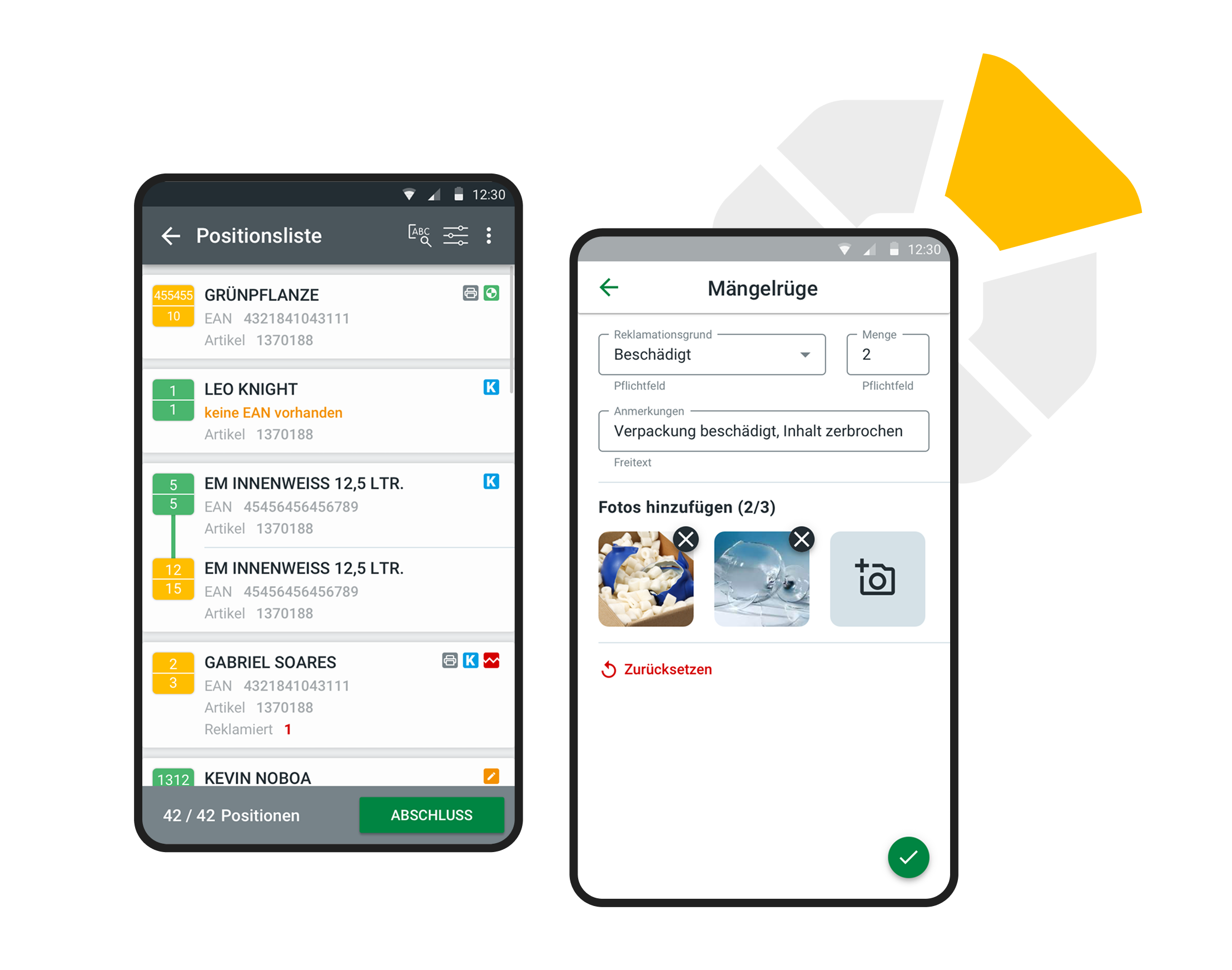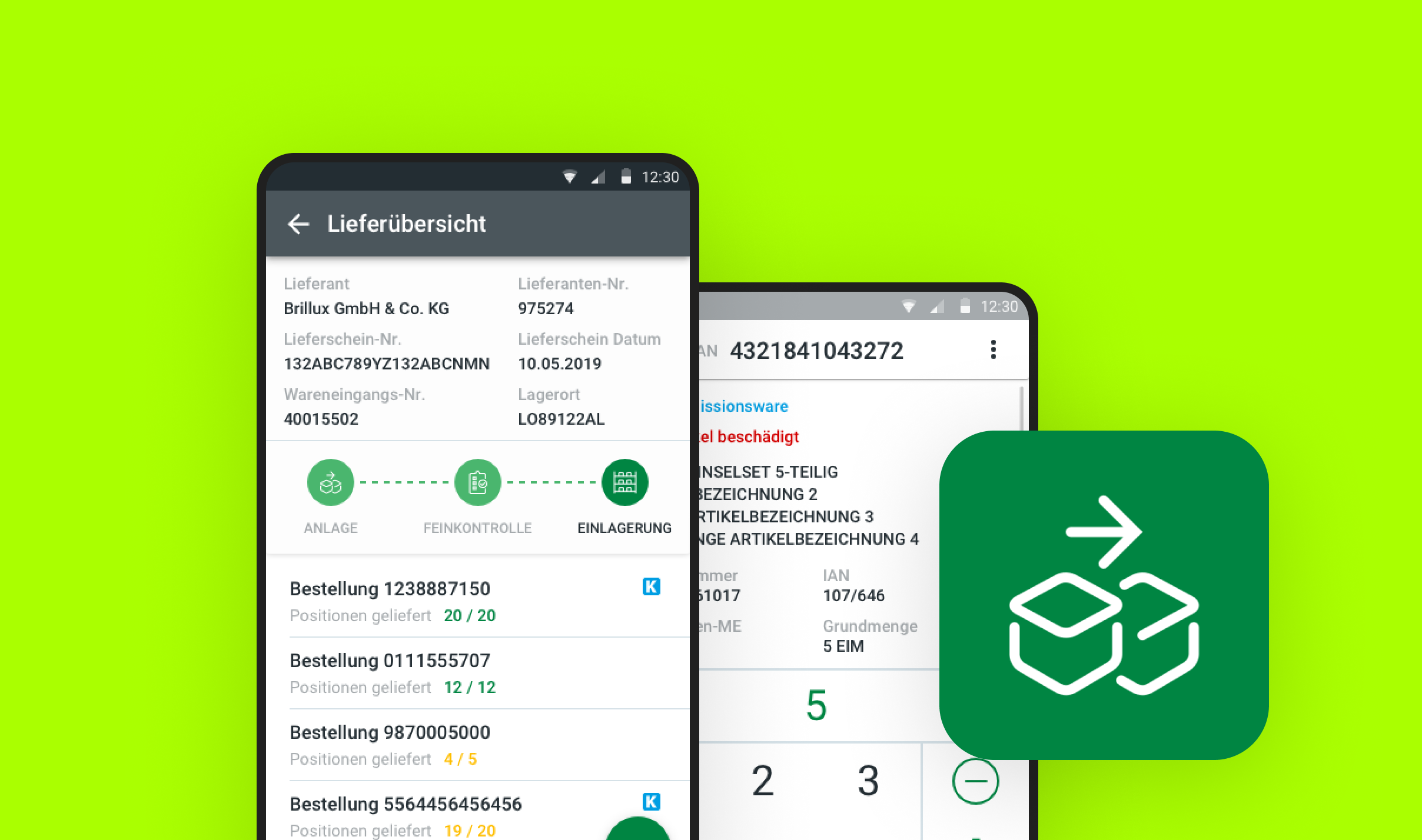 Die App ist speziell für Android-Geräte mit integriertem Scanner optimiert, wodurch das Scannen von Barcodes an der Ware ermöglicht wird.